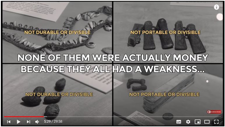 Over the years in history, people were able to discover that the items they used as money did not meet the 5 criteria for real money. So they changed from ‘trade by barter’ to ‘commodity currency’ to ‘precious metals’ to ‘paper money’.