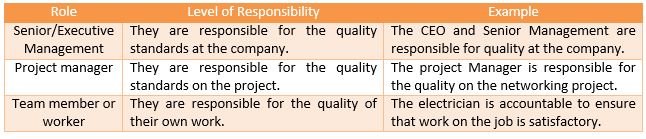A project can have high quality standards only if the quality management plan trickles down from top to bottom. There are a number of upcoming contracting forms which work on projects but do not seem to meet the quality standards they desire. They sometimes feel their workmen are the problem and thus, there is constant recycling of employees due to the desire to improve the company’s quality on projects; this is a misconception. According to the Project Management Institute’s Body of Knowledge, PMBOK 5th Edition, “quality is the primary responsibility of the Management of a company”. The table below shows the hierarchy of stakeholder responsibility to quality: