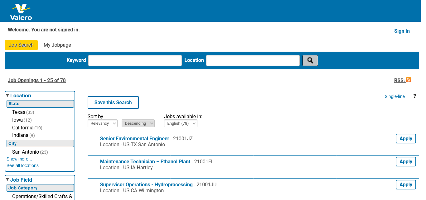 Valero 74 https://valero.taleo.net/careersection/2/jobsearch.ftl?lang=en