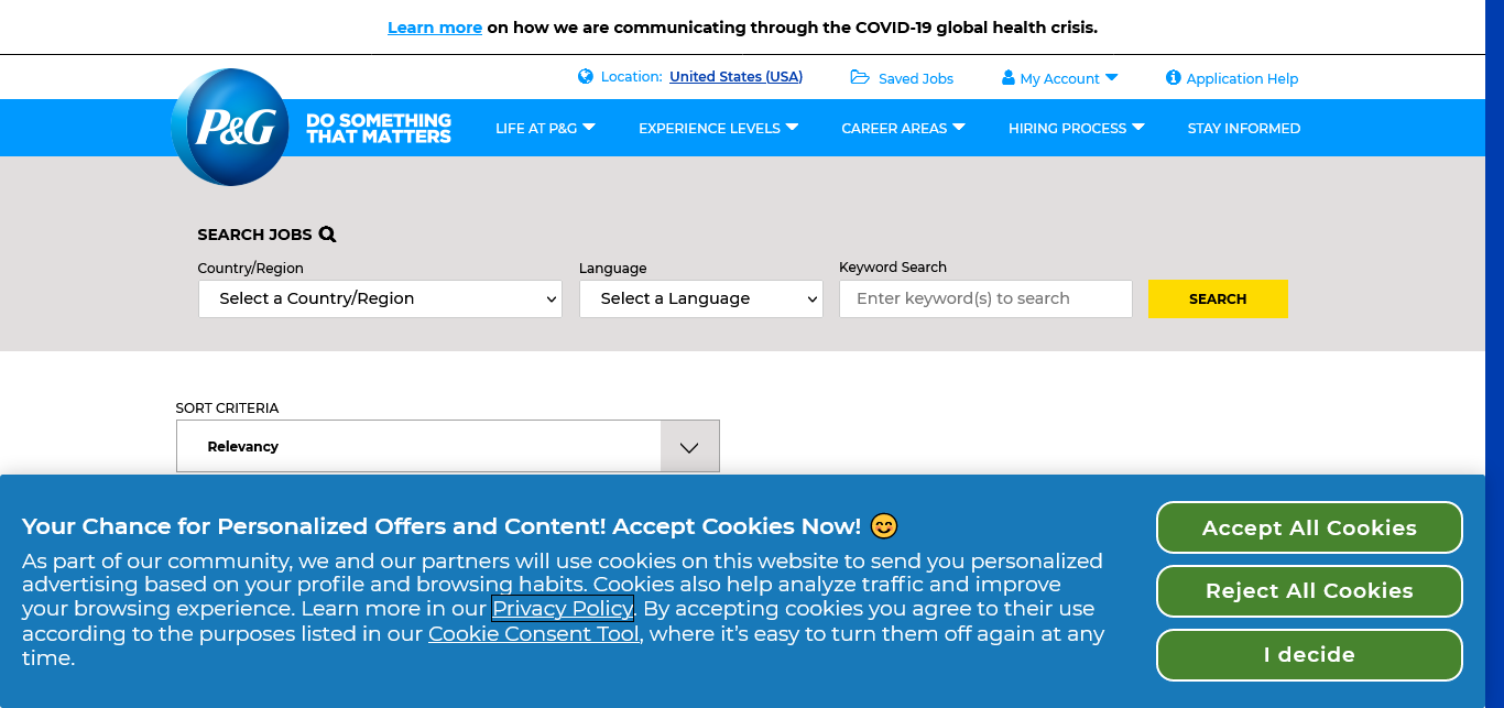 Procter & Gamble Hygiene and Health Care Ltd 1304 https://www.pgcareers.com/search-jobs?ascf=%5B{%27key%27:%27custom_fields.Language%27,%27value%27:%27English%27},]