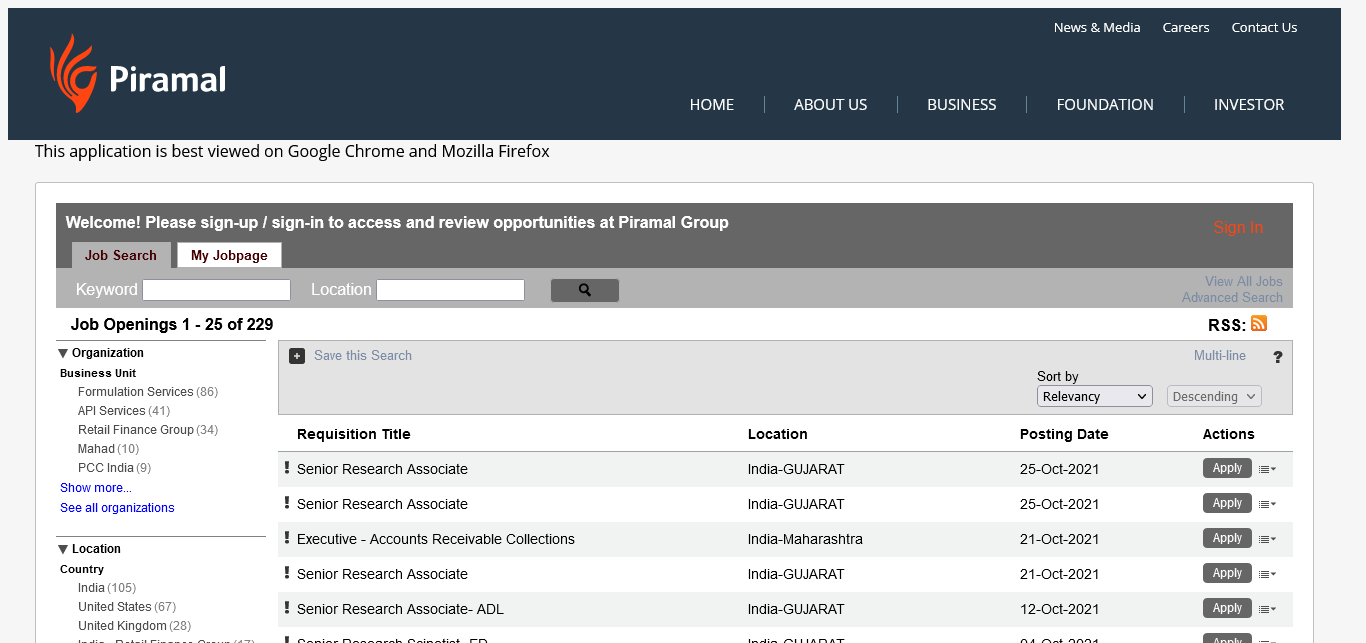 Piramal Enterprises Ltd 229 https://piramal.taleo.net/careersection/ex/jobsearch.ftl?lang=en&portal=101430233