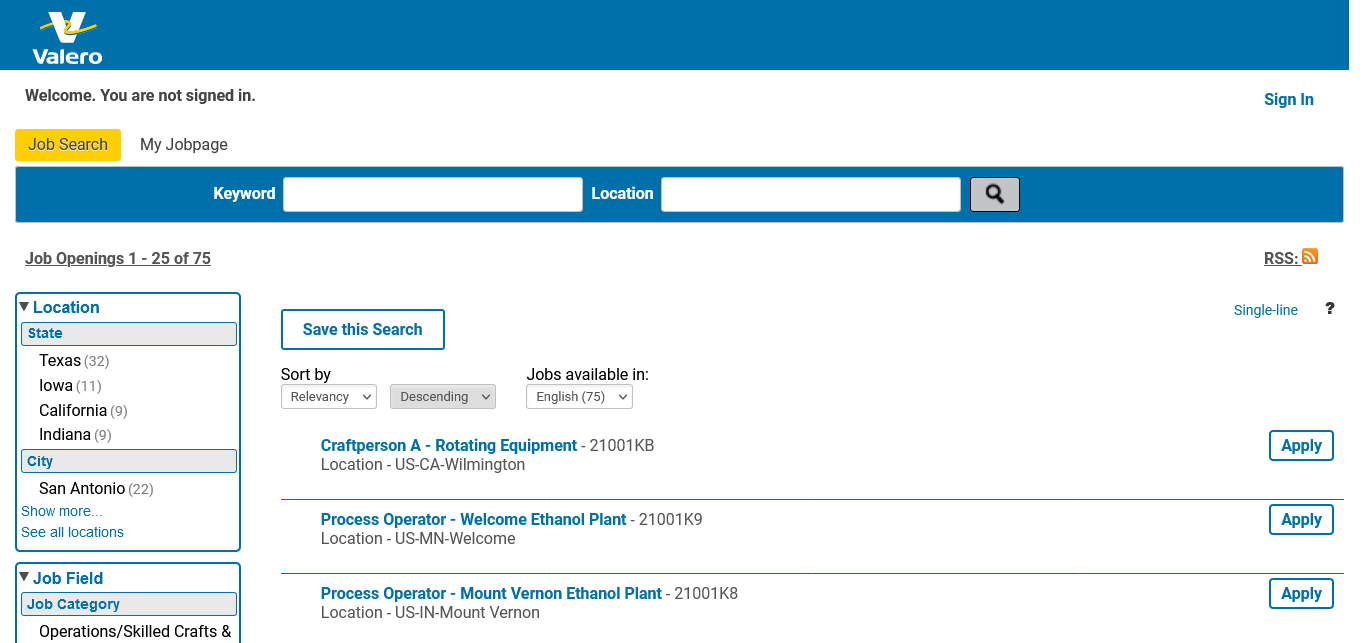 Valero 74 https://valero.taleo.net/careersection/2/jobsearch.ftl?lang=en