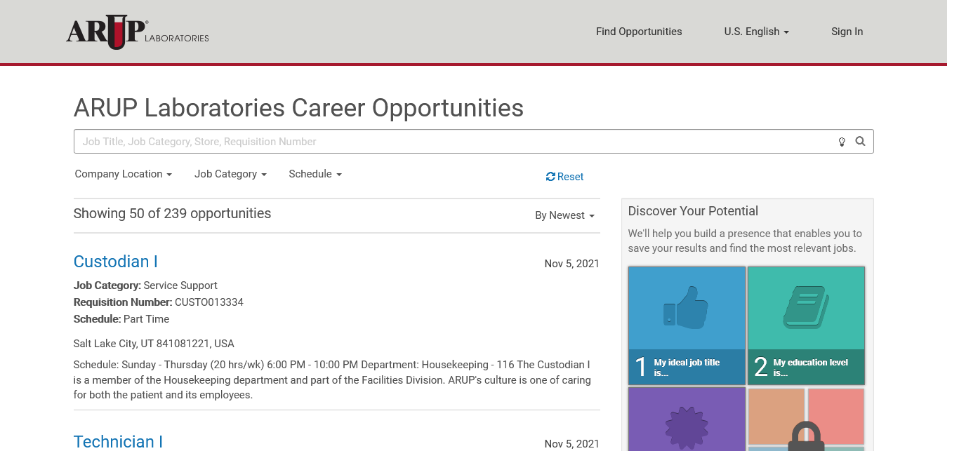 Arup Laboratories 217 https://recruiting2.ultipro.com/ARU1000ARUP/JobBoard/62cc791d-612e-42e6-909f-0de27efe2038/?q=&o=postedDateDesc