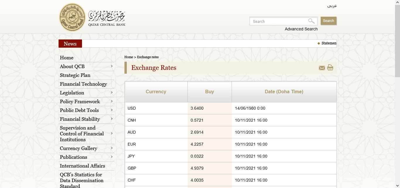 Qatar Central Bank http://www.qcb.gov.qa/English/Pages/ExchangeRates.aspx