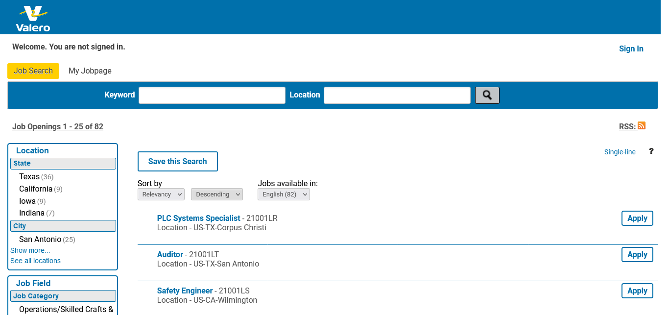 Valero 74 https://valero.taleo.net/careersection/2/jobsearch.ftl?lang=en