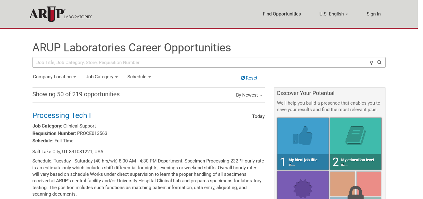 Arup Laboratories 217 https://recruiting2.ultipro.com/ARU1000ARUP/JobBoard/62cc791d-612e-42e6-909f-0de27efe2038/?q=&o=postedDateDesc