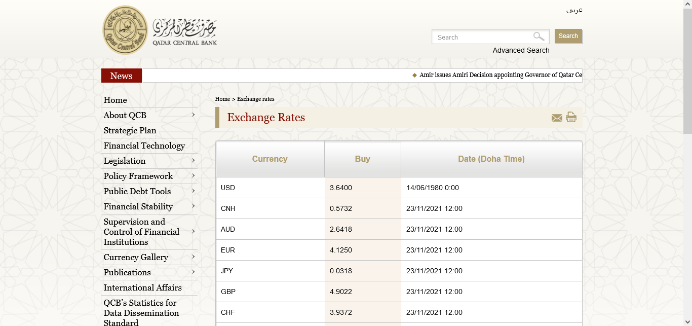 Qatar Central Bank http://www.qcb.gov.qa/English/Pages/ExchangeRates.aspx