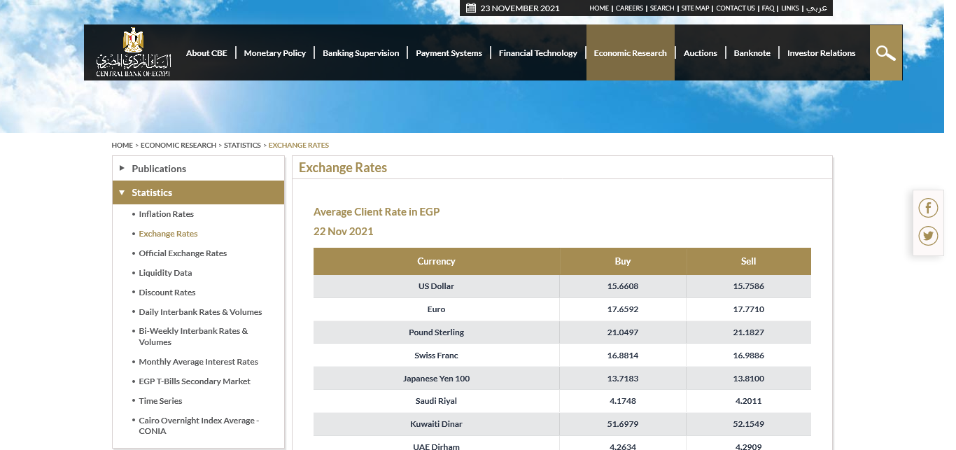 Central Bank of Egypt https://www.cbe.org.eg/en/EconomicResearch/Statistics/Pages/ExchangeRatesListing.aspx