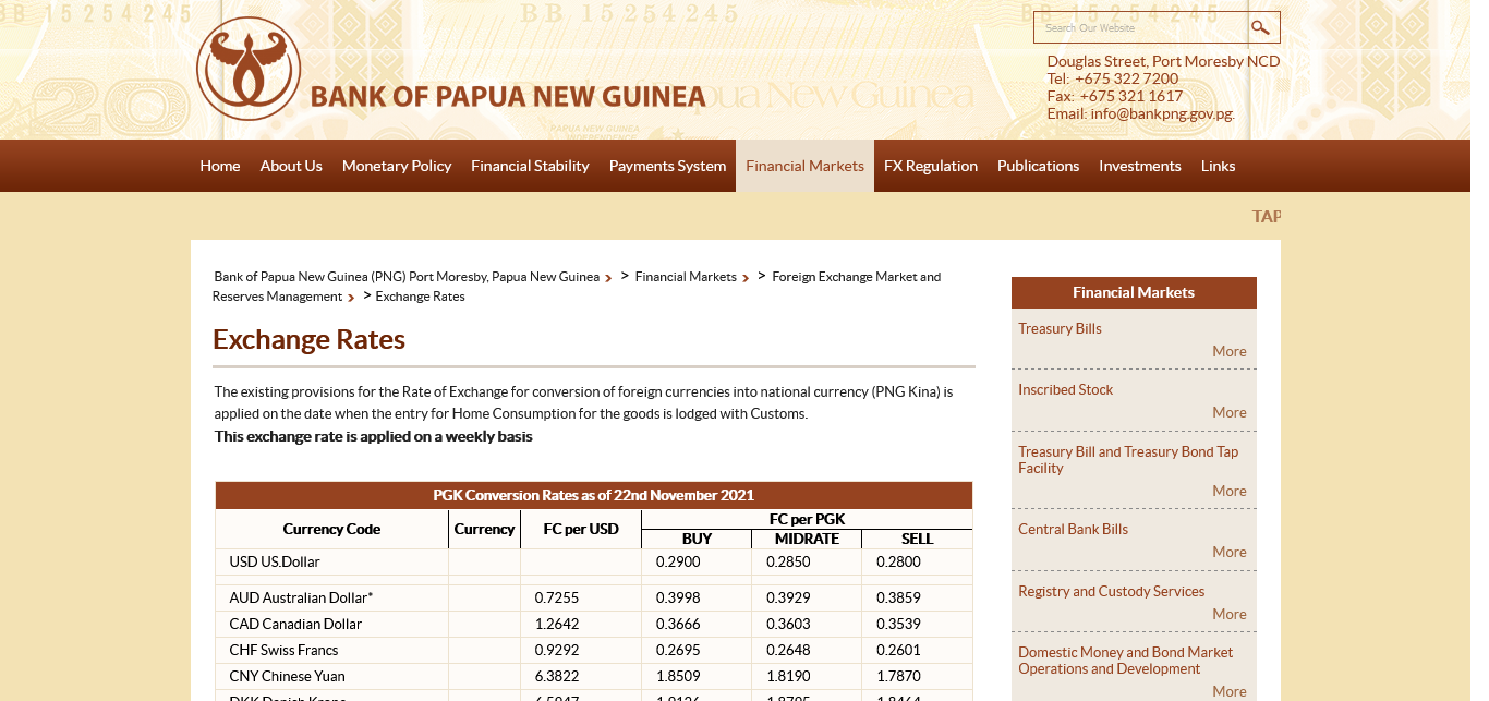 Bank of Papau New Guinea https://www.bankpng.gov.pg/financial-markets/foreign-exchange-market-andreserves-management/exchange-rates/
