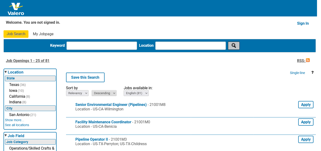 Valero 74 https://valero.taleo.net/careersection/2/jobsearch.ftl?lang=en