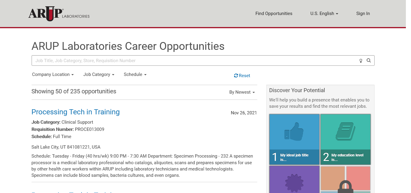 Arup Laboratories 217 https://recruiting2.ultipro.com/ARU1000ARUP/JobBoard/62cc791d-612e-42e6-909f-0de27efe2038/?q=&o=postedDateDesc