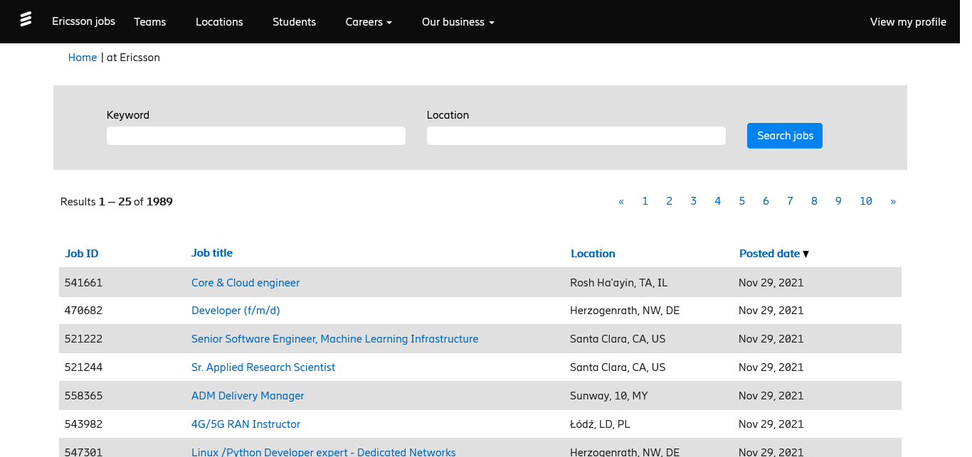 Ericsson 1,595 https://jobs.ericsson.com/search/?page=1&jobPipeline=careersite&utm_source=ericsson.com&utm_medium=referral&utm_campaign=search_widget&q=&locationsearch=&optionsFacetsDD_shifttype=