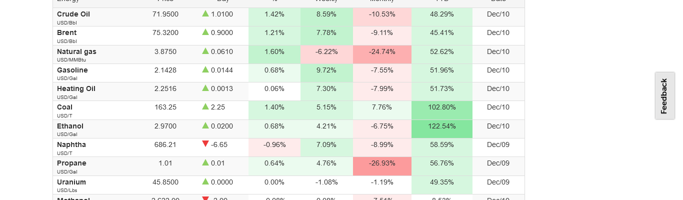 Commodity Prices – 21:35 GMT 10th December 2021