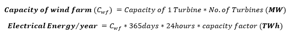 The capacity is the electrical strength of a wind farm at a given moment, usually measured in kilowatt (KW), Megawatt (MW) and Gigawatt (GW). While energy supplied is measured in kilowatt hour (KWh), Megawatt hour (MWh), Gigawatt hour (GWh) and Terawatt hour (TWh). Although often confused, each their actual units are Joules per second and Joule hours per second.