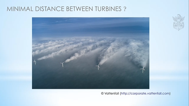 Depending on turbulent intensity (TI), the distance between wind turbine towers can be about 13D. This ensures that if wind passes through the upstream turbine blades, there is enough time for the wind density (wake) to recover by the time it gets to the next wind turbine blades in the wind path.