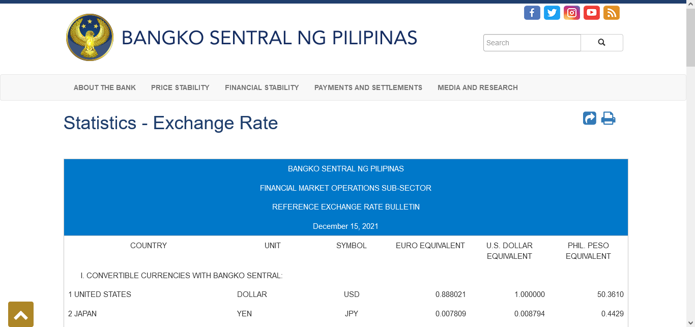Bangko Sentral NG Pilipinas https://www.bsp.gov.ph/SitePages/Statistics/ExchangeRate.aspx