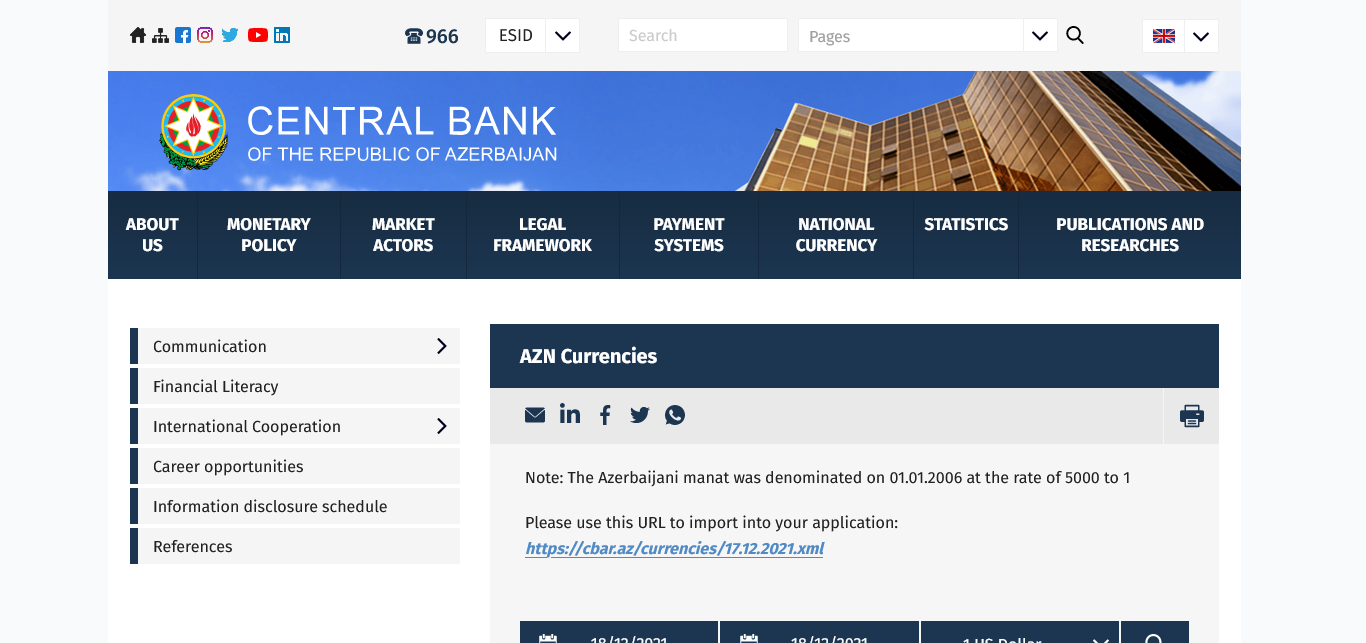 Central Bank of the Republic of Azerbaijan https://www.cbar.az/currency/rates?language=en