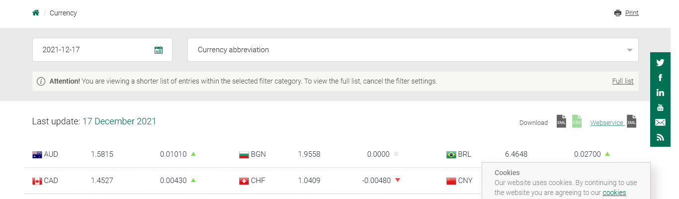 Czech National Bank https://www.cnb.cz/en/financial-markets/foreign-exchange-market/central-bank-exchange-rate-fixing/central-bank-exchange-rate-fixing/