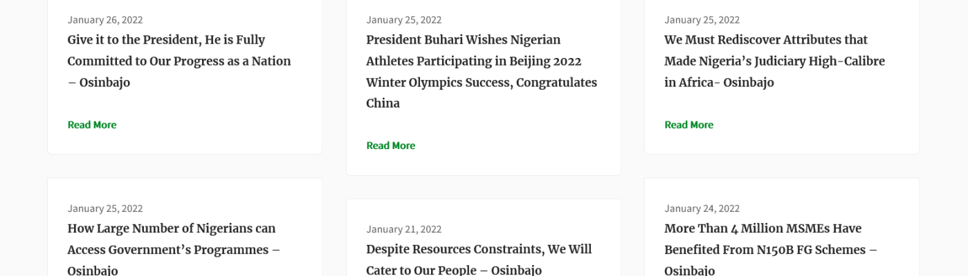 FGN News – How Large Number of Nigerians can Access Government’s Programmes – Osinbajo The State House, Abuja – Federal Government of Nigeria News https://statehouse.gov.ng/ Share this: Share on X (Opens in new window) X Share on Facebook (Opens in new window) Facebook Like Loading... Related