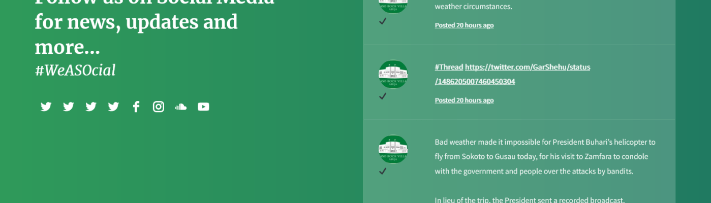 FGN News – Bad weather made it impossible for President Buhari’s helicopter to fly from Sokoto to Gusau today The State House, Abuja – Federal Government of Nigeria News https://statehouse.gov.ng/ Share this: Share on X (Opens in new window) X Share on Facebook (Opens in new window) Facebook Like Loading... Related