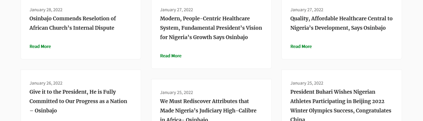 FGN News – Quality, Affordable Healthcare Central to Nigeria’s Development, Says Osinbajo The State House, Abuja – Federal Government of Nigeria News https://statehouse.gov.ng/ Share this: Share on X (Opens in new window) X Share on Facebook (Opens in new window) Facebook Like Loading... Related
