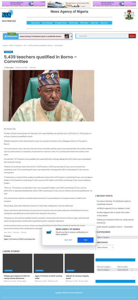 News Agency of Nigeria – 5,439 teachers Qualified in Borno – Committee Share this: Share on X (Opens in new window) X Share on Facebook (Opens in new window) Facebook Like Loading... Related