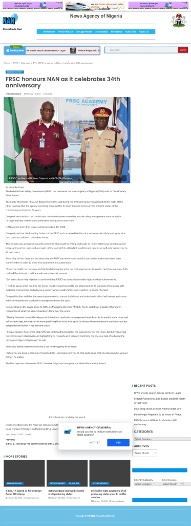 News Agency of Nigeria – FRSC Honours NAN as it Celebrates 34th Anniversary Share this: Share on X (Opens in new window) X Share on Facebook (Opens in new window) Facebook Like Loading... Related