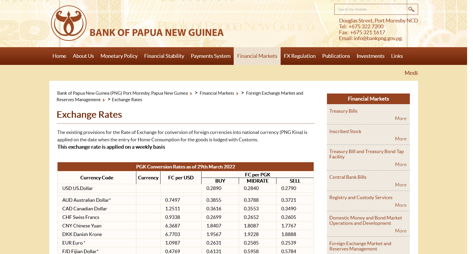 Bank of Papau New Guinea https://www.bankpng.gov.pg/financial-markets/foreign-exchange-market-andreserves-management/exchange-rates/