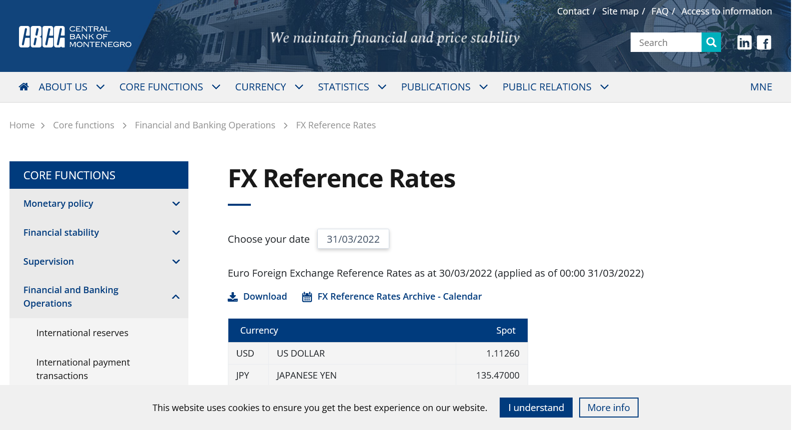 Central Bank of Montenegro https://www.cbcg.me/en/core-functions/financial-and-banking-operations/fx-reference-rates