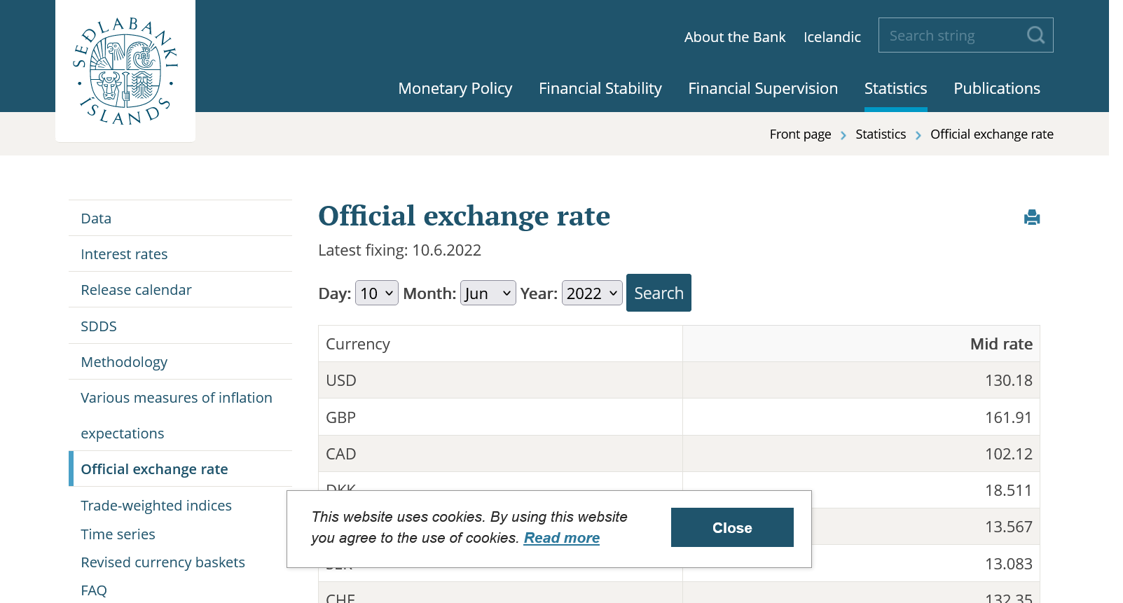 Sedlabanki Islands https://www.cb.is/statistics/official-exchange-rate/