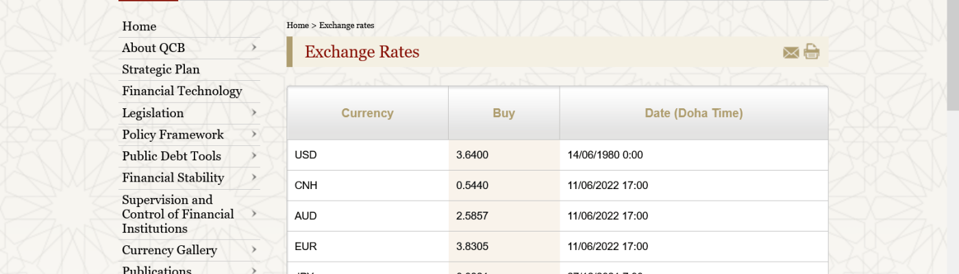Qatar Central Bank http://www.qcb.gov.qa/English/Pages/ExchangeRates.aspx