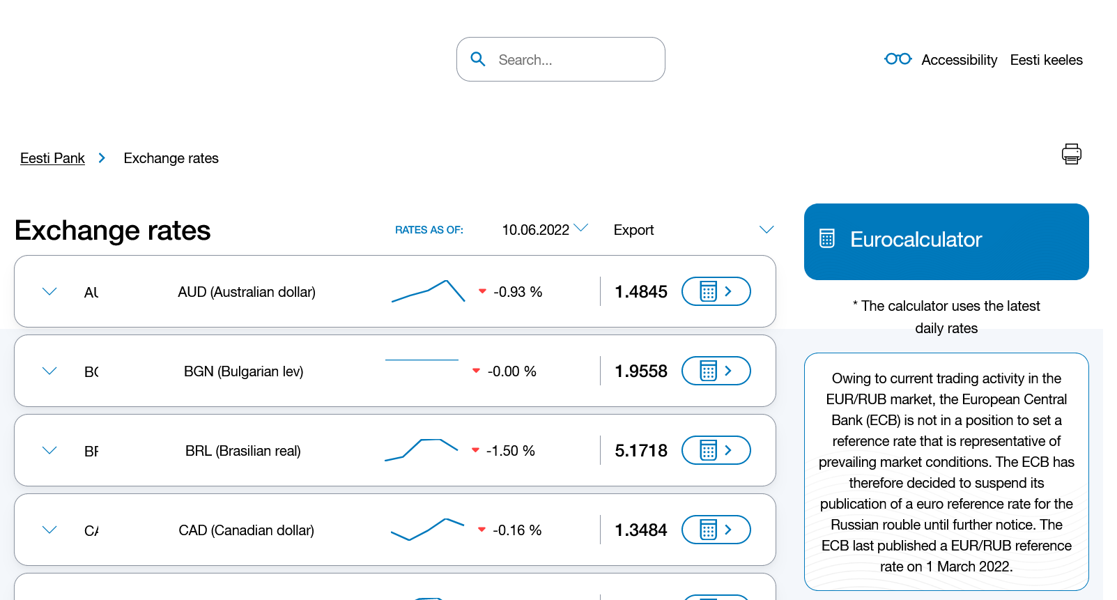 Estonia Bank https://www.eestipank.ee/en/currency-exchange