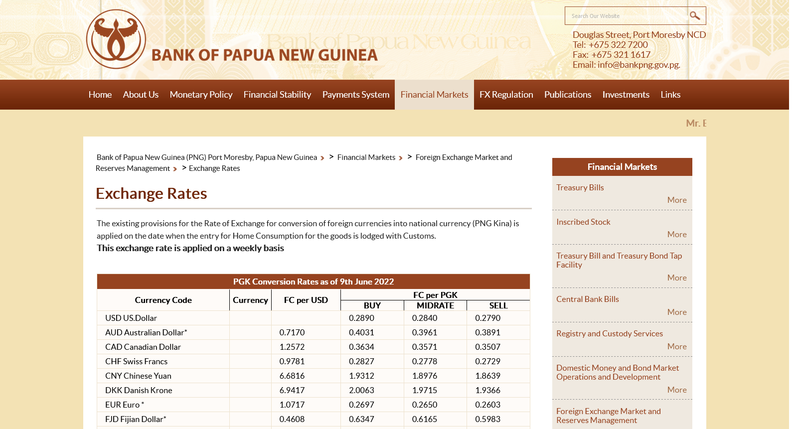 Bank of Papau New Guinea https://www.bankpng.gov.pg/financial-markets/foreign-exchange-market-andreserves-management/exchange-rates/