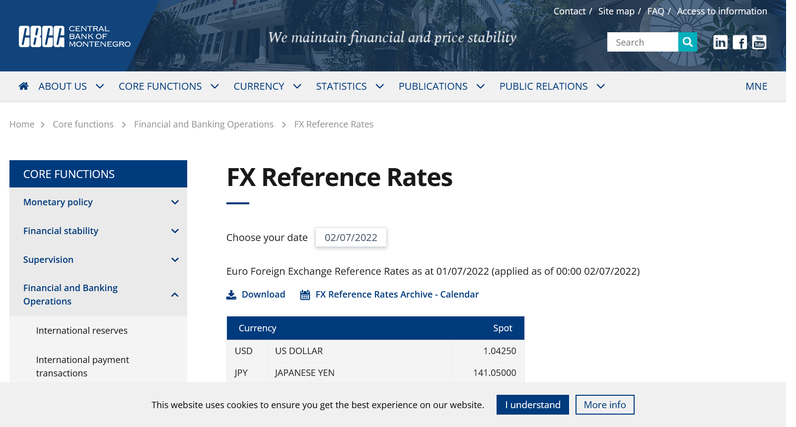 Central Bank of Montenegro https://www.cbcg.me/en/core-functions/financial-and-banking-operations/fx-reference-rates