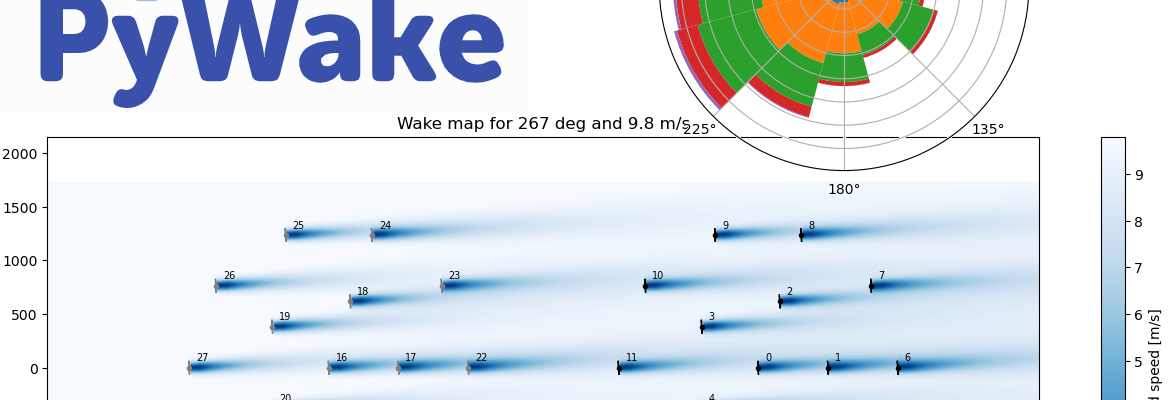 PyWake is an open-source Python library developed specifically for modeling and simulating wind farms. Developed by DTU Wind Energy, PyWake provides a framework to evaluate and optimize wind farm layouts and understand complex aerodynamic interactions within a wind farm.