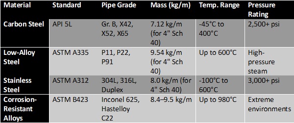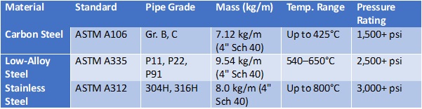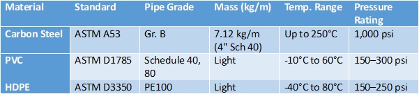Having identified possible material candidates, the temperature and pressure capacities of these pipes should be confirmed. A selection is made of the pipe. Where multiple pipes still fit the bill, then a third control should be the cost of unit lengths of individual pipes. Which ultimately lays to rest any pipe selection controversy. Below in section 4.0 are tables showing the properties of common pipe materials as per the industry.