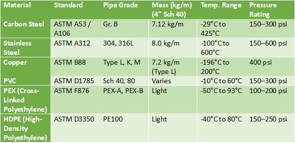 4.0 Properties of Common Pipe Materials per Industry