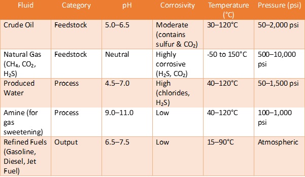 Once the industry in question is ascertained, the unknowns as to the internal fluids of a pipe, and the possible external environmental fluids or chemical properties is clearer. It will be unheard of for a pipeline containing milk be transported via sea bottom means to a different geographical location. This however occurs for oil & gas products. Corrosion of a fluid or environment can be classed based on the pH level or from National Association of Corrosion Engineers, NACE for certain fluids.