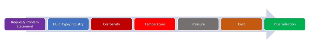 Where does one begin if given a project arbitrarily and told to make a decision on the type of material for a pipe job. There are times where customer requests come from industries outside our specialty. And in a fast paced world, a mental overview of such a process is necessary. Piping as distinct from pipeline are the interconnections between units in a facility similar to a LAN; local area network, while a pipeline connects facilities at distant geographical locations, similar to a WAN; wide area network. The considerations towards sound decision making in pipe selection involve customer request, fluid involved, corrosion, temperature, pressure and cost. Here, we dive into the intricate aspects of piping/pipeline material selection and condense the information into a birds eye-view flowchart that can be utilised by experienced personnel and novices alike to solve real-world challenges.