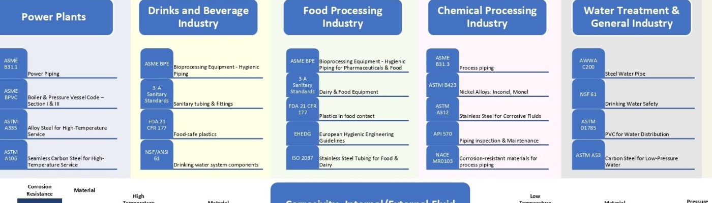- ASME BPE (Bioprocessing Equipment – Hygienic Piping for Pharmaceuticals & Food)