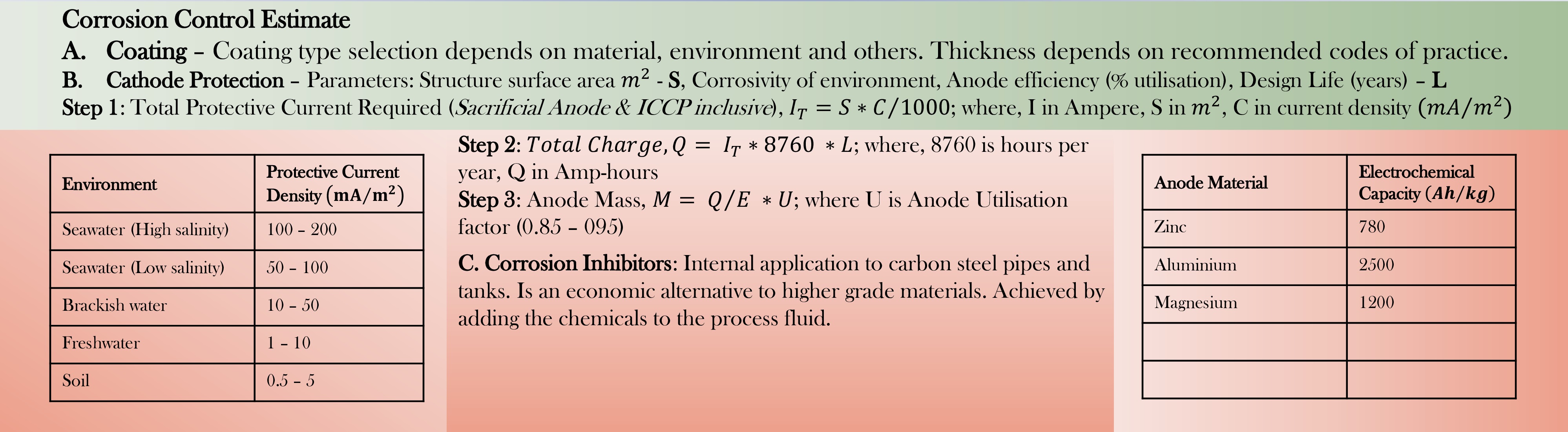 Cathode protection is a balancing of the electrochemical reaction occurring between a structure and the environment by substituting electron loss through a different source other than the metal structure or pipe. There exists Sacrificial Anode CP (SACP) and Impressed Current CP (ICCP). SACP utilises the natural galvanic potential of a metal to supply electrons for the process. For example, Aluminium may be used as a sacrificial anode seeing its high natural potential for migration of electrons. For ICCP, an external current is used to activate the reaction. In this case, materials which are less reactive such as graphite may be used to provide the current protection. Below is a guide on how to estimate the current for both SACP, ICCP and to quantify the mass of sacrificial anode to be used.