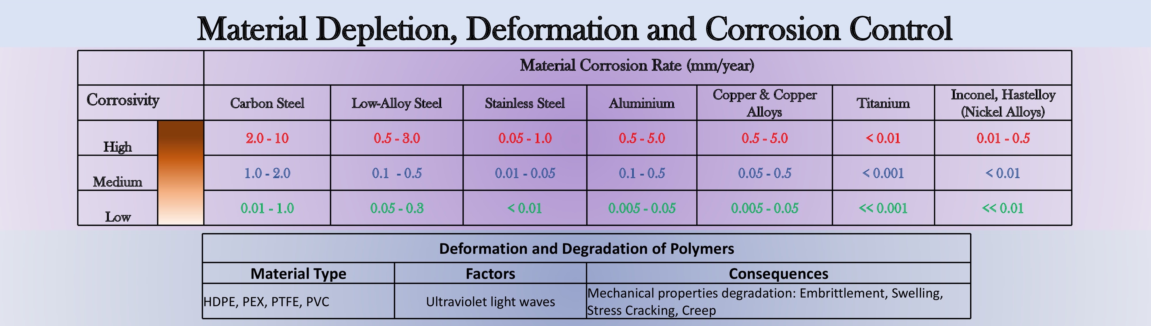 Corrosivity of the internal/external environment surrounding a structure or pipe determine the type material to be used. Additional criteria is the stress requirements and operating temperature. All these are in view of the cost and other lesser but important factors, such as applicability in the field. The corrosion estimates can be seen above which aids design decision for incorporating other corrosion prevention methods. Other reinforced plastic materials do not corrode; however, they are susceptible to ultraviolet, UV induced deformations.