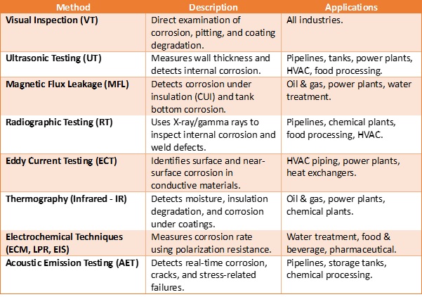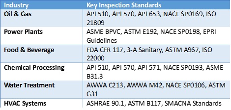 Corrosion inspection in various industries follows specific non-destructive testing (NDT) techniques and codes/standards to ensure structural integrity, safety, and compliance.