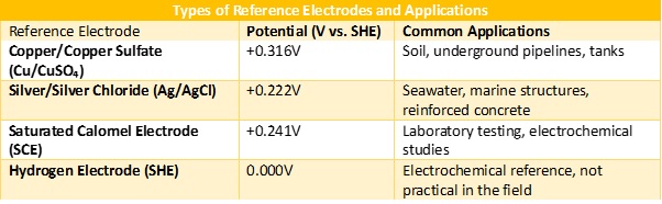 - Example: Carbon steel pipelines should maintain a potential below -850 mV (vs. Cu/CuSO₄ electrode) in soil.