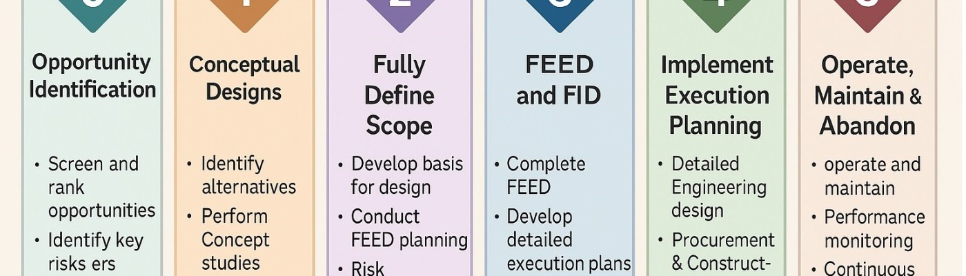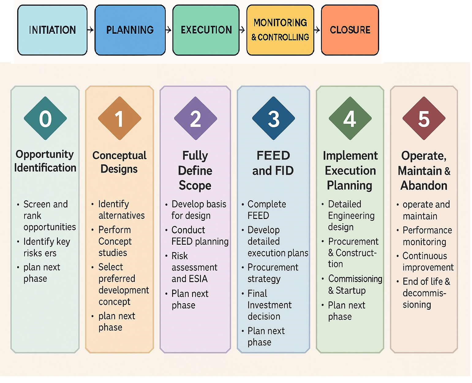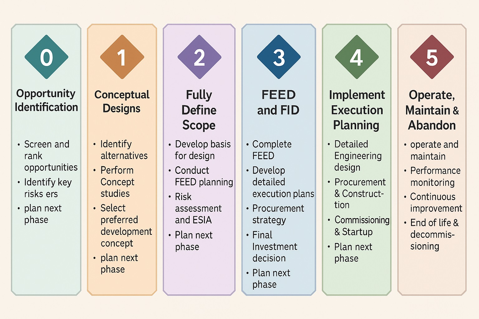 In subsequent years, oil & energy majors began experimenting with the system approach to phasing projects. Stage-gates was adopted, adapted, improved and it later birthed the Decision Gate framework. Here is an info-graphic of decision gates for complex projects. See reference below for a comprehensive Decision Gate info-graphic by a major company. The main difference between a regular project phases from project management standards and Decision Gates is that the regular project management phases focus on project life cycle: from cradle to commissioning, while the latter focuses on project life-cycle: from cradle to commissioning, operation and decommissioning i.e, from cradle to grave. The usual project phase stops at Decision Gate 4.