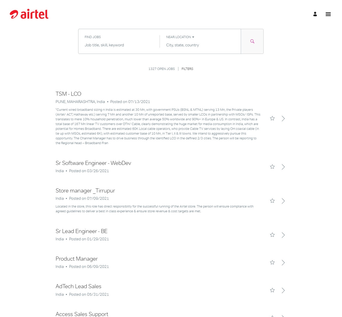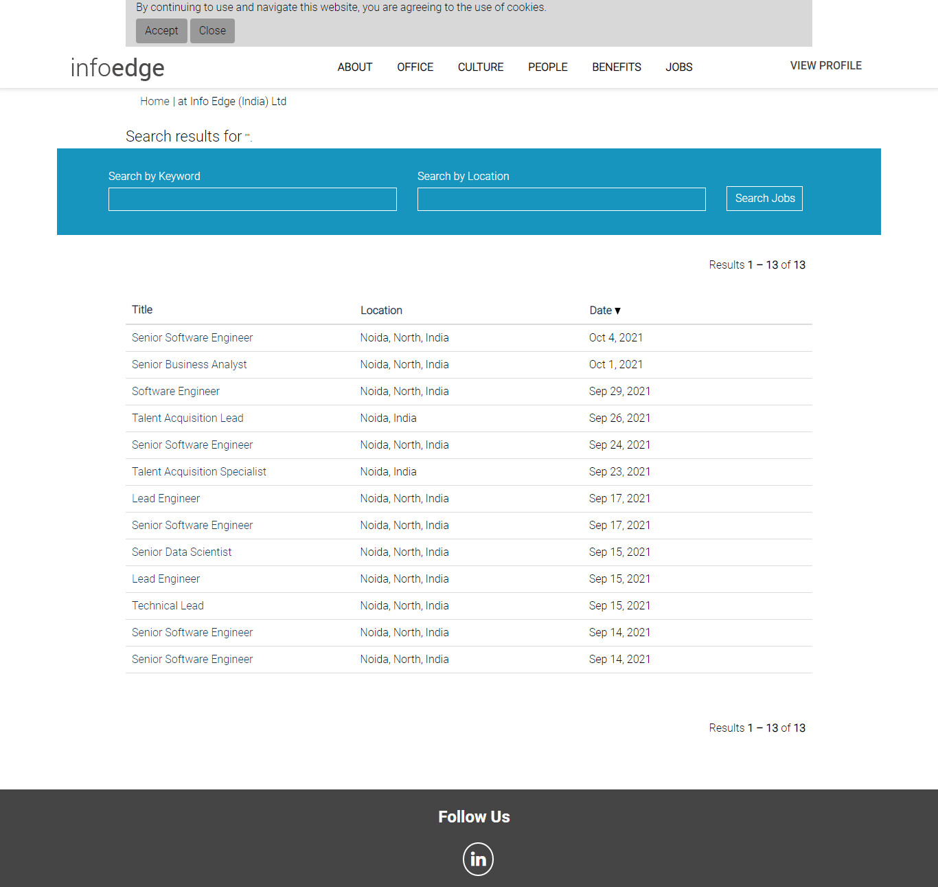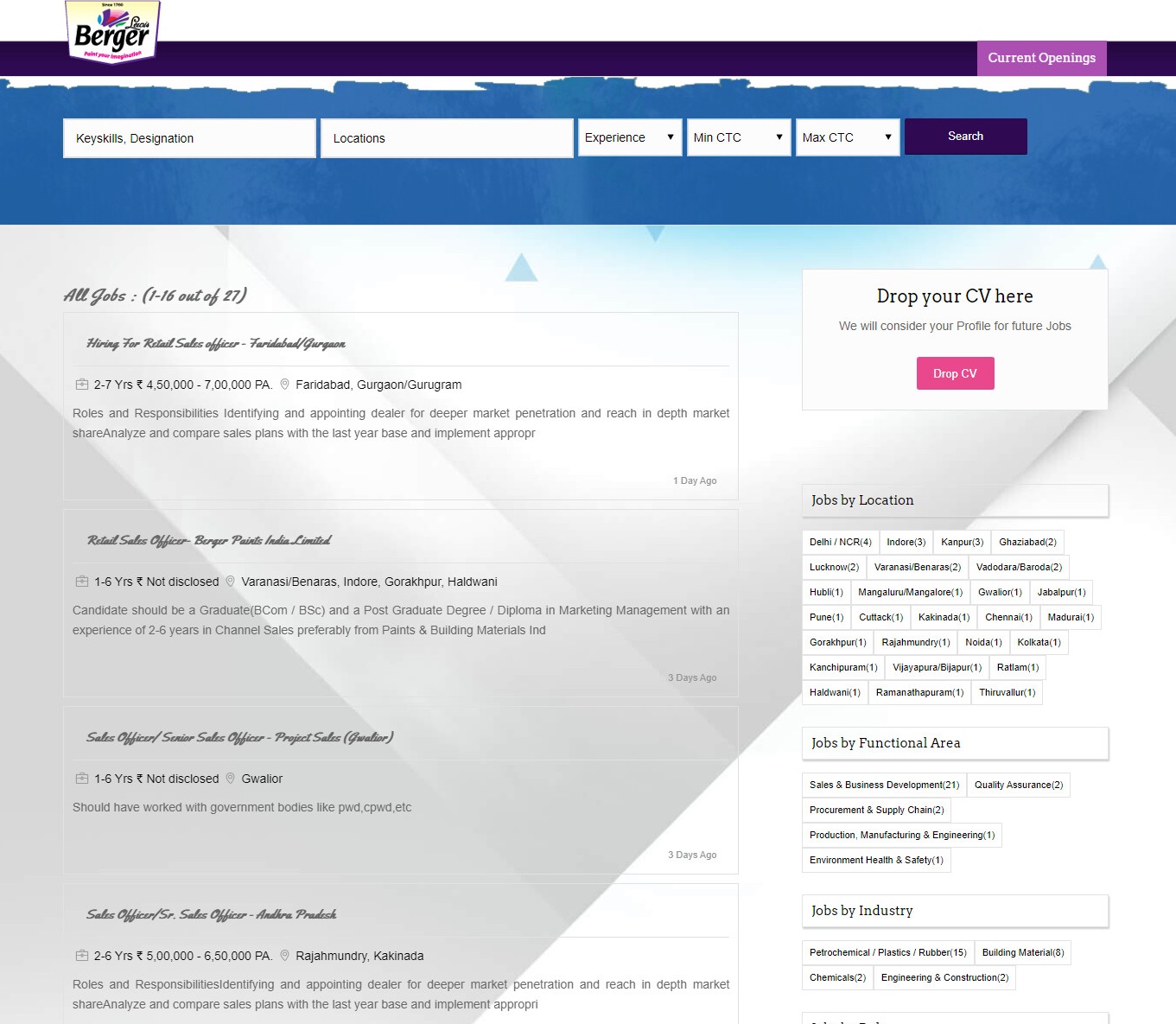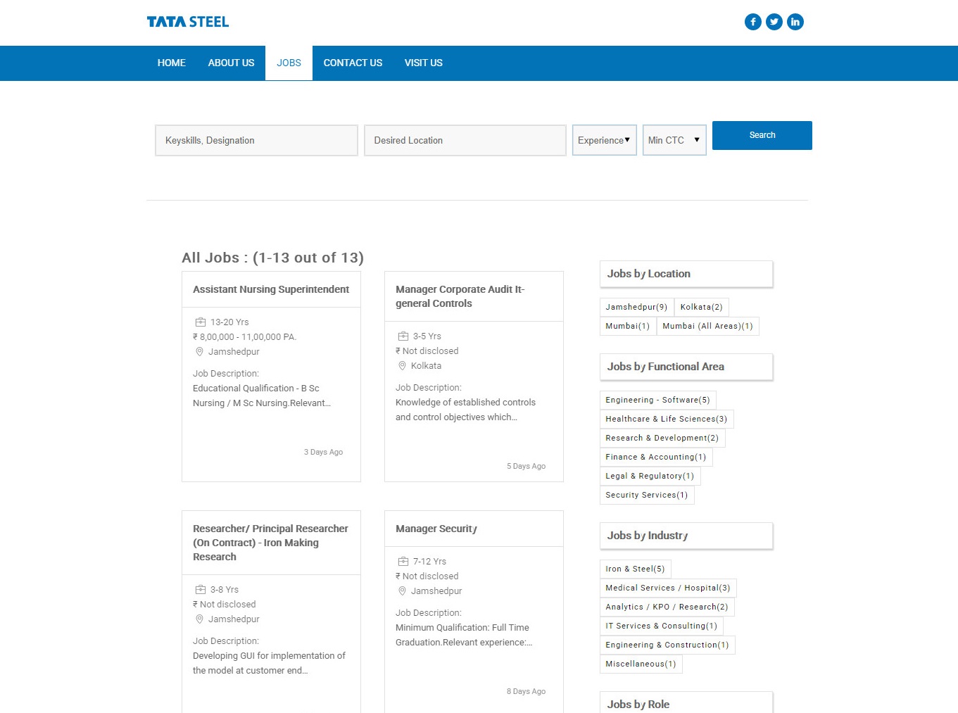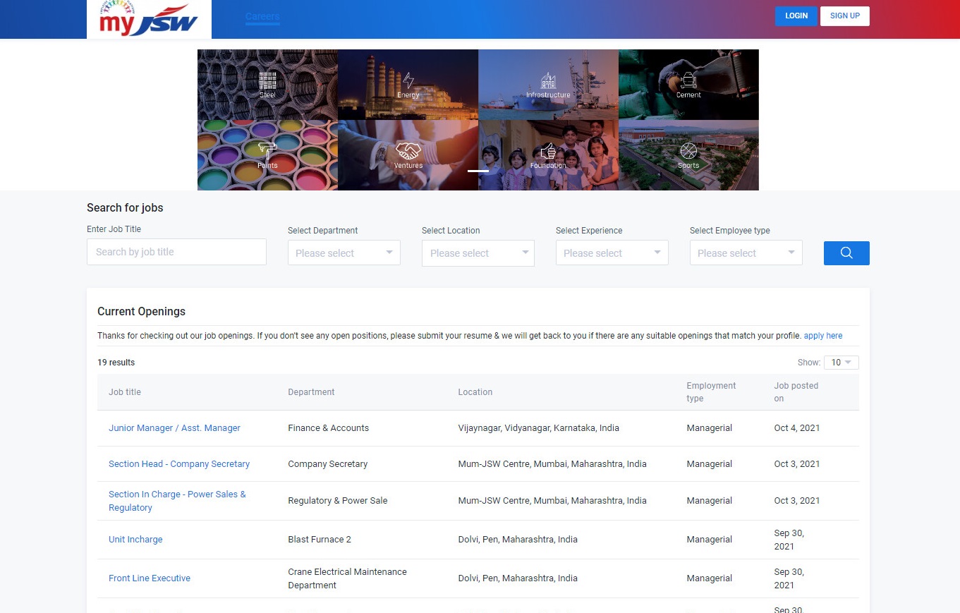 https://myjsw.darwinbox.in/ms/candidate/careers https://companies.naukri.com/tatasteel-jobs/jobs/ https://adani.taleo.net/careersection/ex/jobsearch.ftl https://hrkwik.pilportal.com/Candidate/GeneralOpening.aspx http://myhr.britindia.com/#/career-page https://careers.infoedge.com/search/?createNewAlert=false&q=&locationsearch= http://careers.bergerpaints.com/